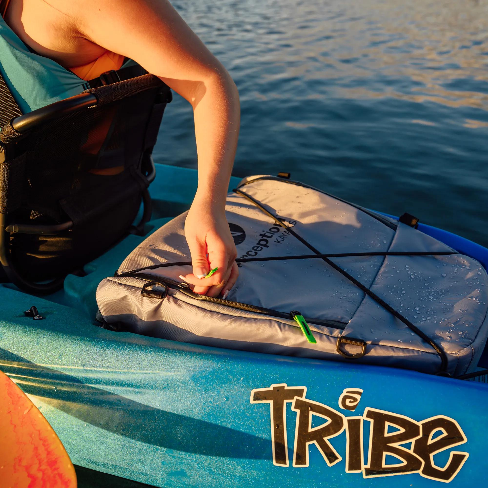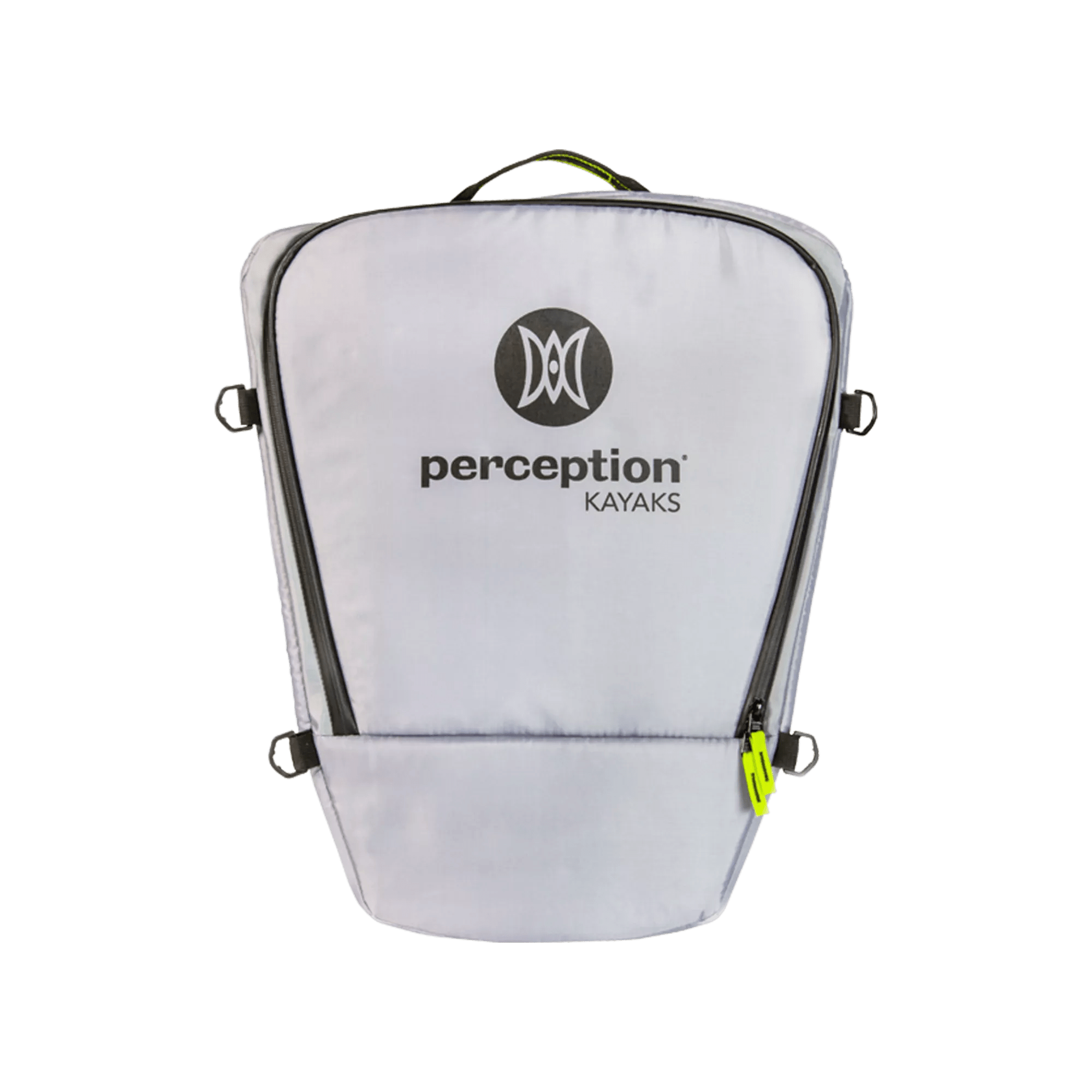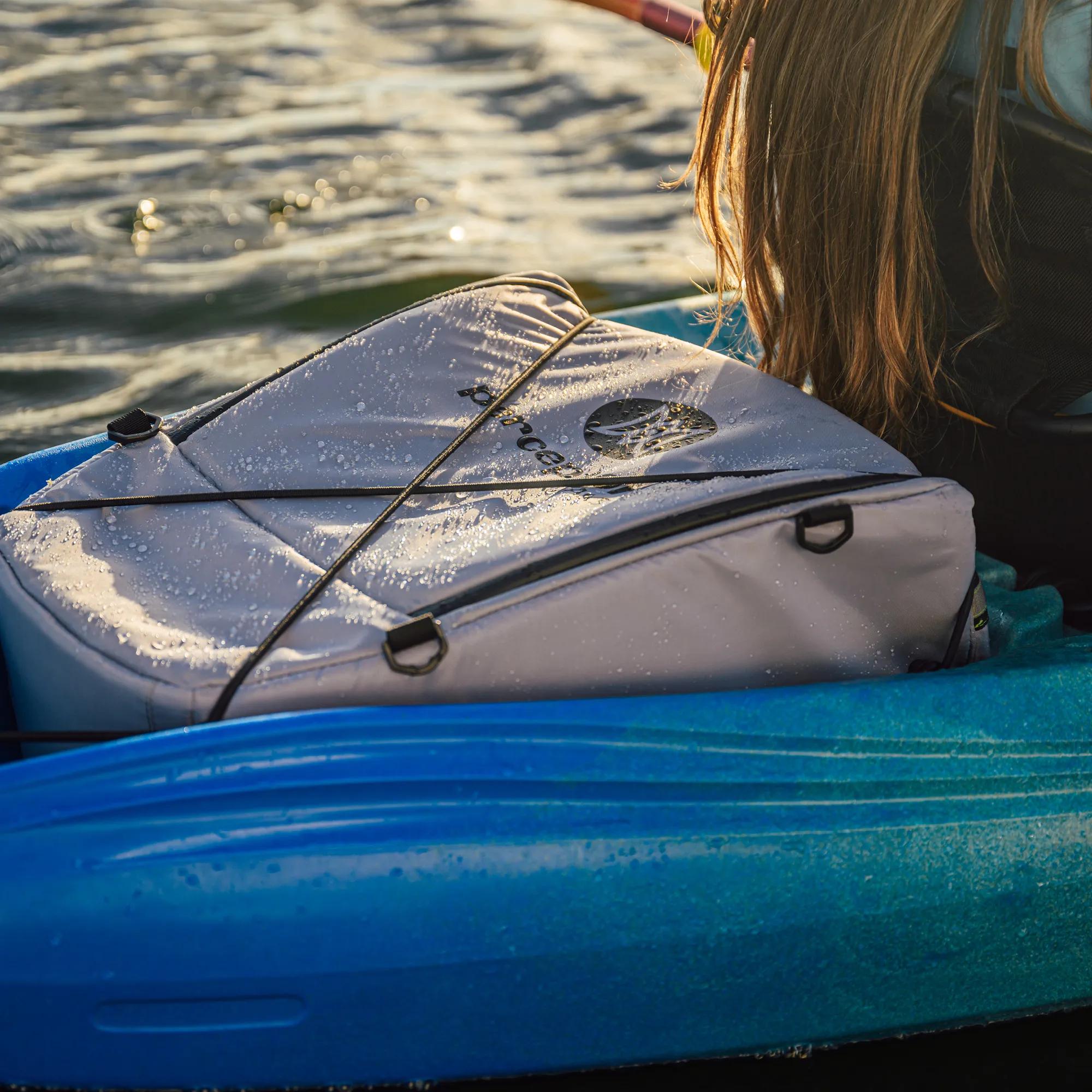 The ultimate kayak soft cooler has arrived and is designed to fit perfectly in the storage wells of sit-on-top kayaks. It's versatile enough for everyday use too! With a zippered opening on top for ultimate convenience when accessing drinks and food, this cooler also has a low-profile shape to minimize the impact of wind. The YKK water-resistant zipper, water-proof materials, and RF-welded internal seams keep splash and rain out, while the ½” thick insulating foam keeps drinks and food cold all day. Adjustable backpack-style shoulder straps and a strong haul handle make portage easy. 4 D-rings in each corner allow for lashing down to the kayak, and a heavy-duty material on the bottom panel adds durability. This cooler has a capacity of 40 L and can hold 20 cans assuming a 1:1 ratio of ice. It is not intended for submersion or storing fish. The external dimensions are 21.5” L x 8” H x 17.75” W (10” W at small taper side), and the internal dimensions are 18.5” L x 7” H x 16.5” W (9.5” W at small taper side). This cooler is compatible with most sit-on-top kayaks with storage wells and Perception Hook and Perception Sound 10.5 sit-inside models (note: not compatible with the Sound 9.5). Get ready for the ultimate kayaking experience with this soft cooler!